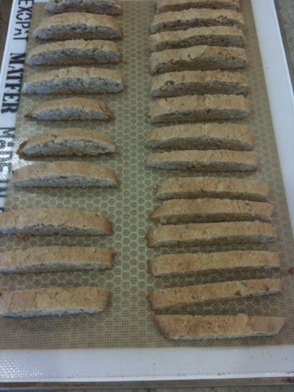 8. Heat oven to 350°F again. Once oven is hot, place biscotti back into oven. Bake until they are browned and crunchy, about 16-20 minutes.