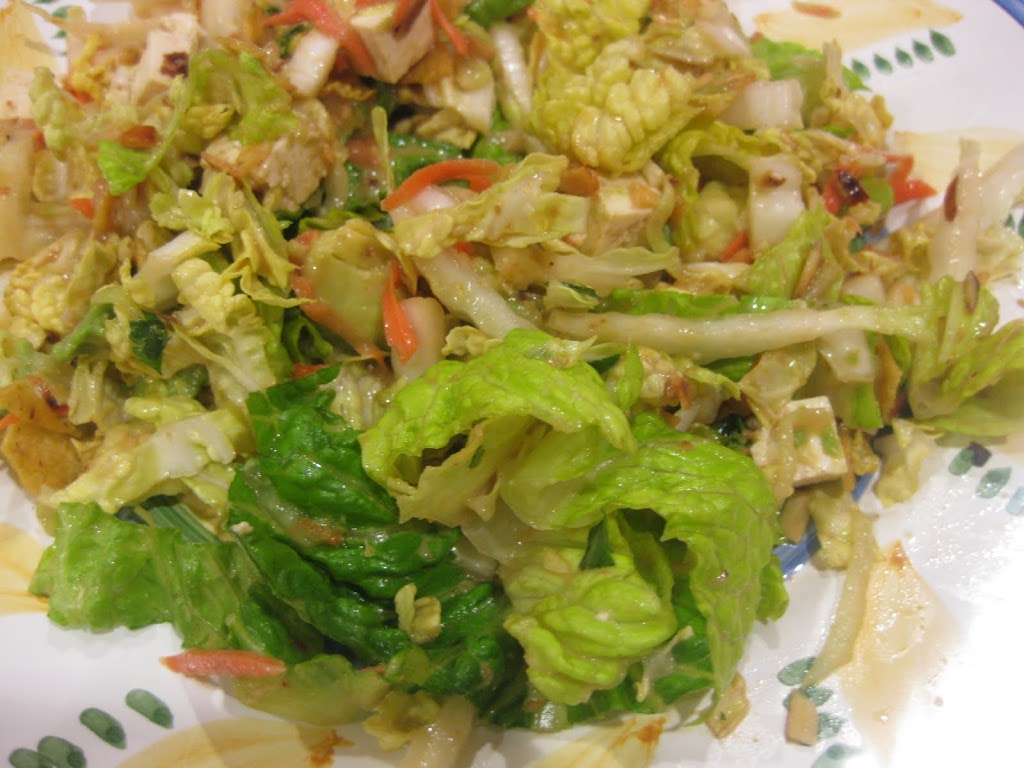 Often when I cook, I use what is on hand or to what I have access. For the salad, I used a combo of shredded napa cabbage and romaine lettuce, cilantro, shredded carrots and cucumbers, toasted sliced almonds and sesame seeds, cubed firm tofu, edamame, crushed tortilla chips, and avocado. Not the original recipe but still delicious.