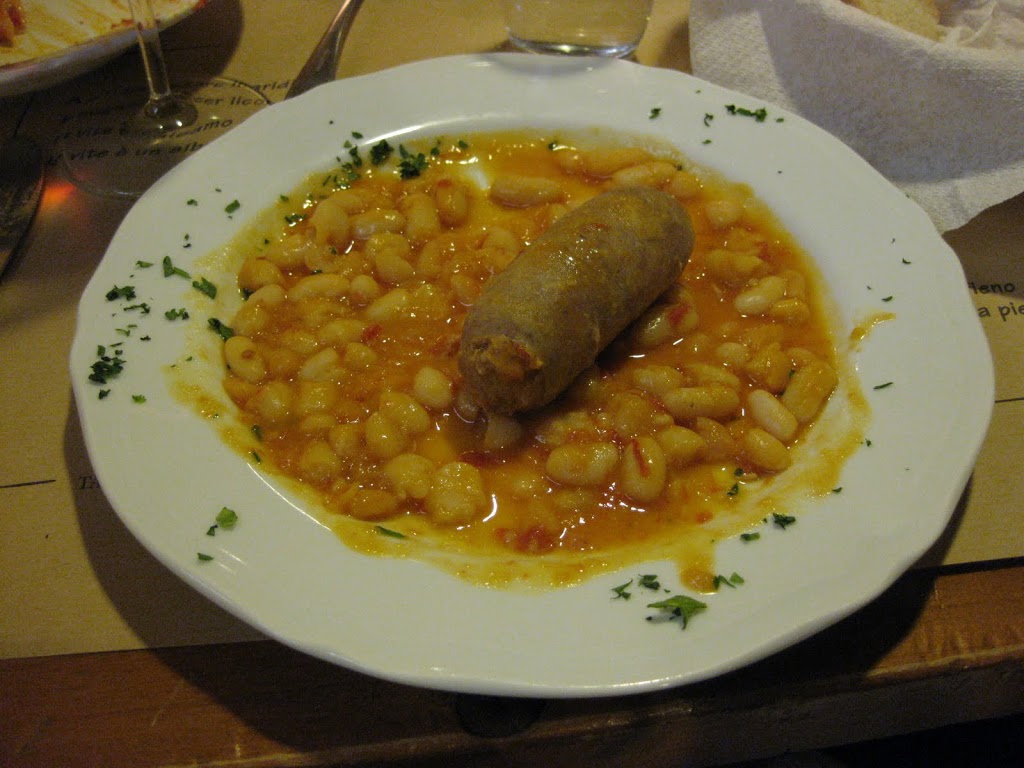 Below is a picture I took of a dish we had in Italy. I’m sure the beans, sausage and tomato sauce were fresh. If you want to take a cheap trip to Italy (ok, you’ll have to close your eyes and imagine), try the recipe below. Enjoy.