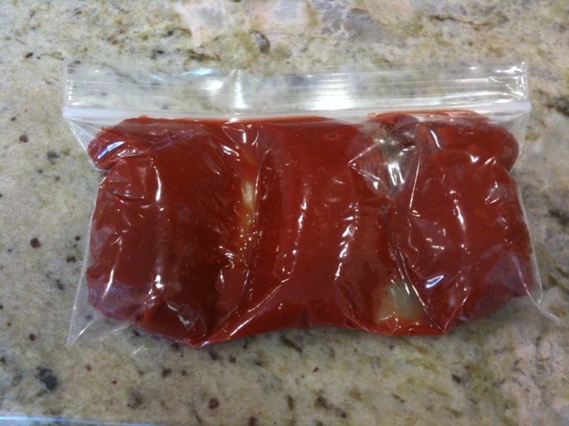 If you never know what to do with leftover tomato paste, check out this tip. Place remaining tomato paste in a small plastic bag and squeeze out most but not all of the air. Make divisions in the bag and place in the freezer. When you need a tablespoon or so, it’s easy to break off a part and the paste will defrost in minutes. This is an example of a tip I’ll be providing in the cookbook.