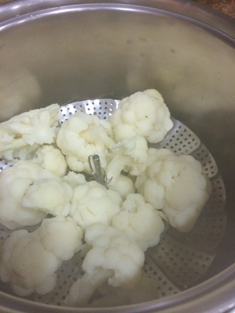 - Steam cauliflower until very tender. Carefully remove the cauliflower with the steamer basket (you might want to transfer to a bowl), drain water from the pot, then add the cauliflower back to the pot. Be careful; it will be hot.
